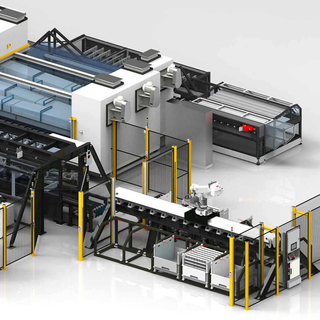The system therefore needed to coordinate multiple operations including automated depalletising, machining processes, robotic transfer, thermal stages and finished product handling while maintaining safe operator access and reliable throughput.